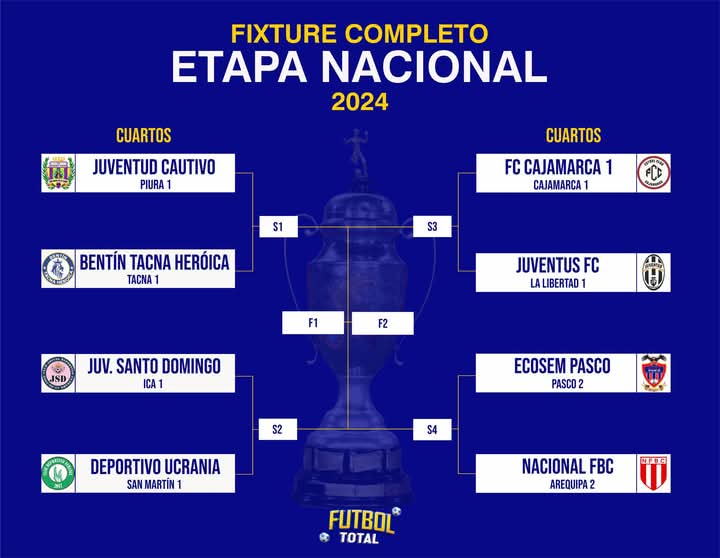 *** Y el domingo pasado, se jugaron los partidos de vuelta de los octavos de final de la Fase Nacional de la Copa Perú, conociendo ya amigos a los 8 equipos que deben desde este sábado 14 en partido único buscando a los dos que finalmente ingresarán a la Liga 2, de donde buscarán ya vuelta, haciendola más larga y costosa, su ingreso a la Liga 1. Aquí los resultados obtenidos: DEPORTIVO UCRANIA 4 – 0 FCR SAN ANTONIO, clasificado el equipo sanmartinense. NUEVO SAN CRISTOBAL 2 – 0 JUVENTID CAUTIVO, clasificándose el equipo de Juventid Cautivo. PACIFICO FC SMP 2 – 1 NACIONAL FBC teniendo en cuenta que igualaron en goles, tuvieron que irse a los penales, ganando Nacional FBC 4 a 2 y por ende clasificándose a a los cuartos de final. VIOARGOCA FC 2 – 1 JUVENTUD SANTO DOMINGO que es el clasificado a los cuartos. FC CAJAMARCA 3 – 0 CULTURAL VOLANTE, se clasifica por m ejor diferencia de goles FC Cajamarca. ECOSEM PASCO 2 – 1 EL INCA CHAO, se clasifica el equipo pasqueño. JUVENTUS FC 3 – 2 CS PARIACOTO por igualar en goles se fueron a los penales ganando Juventus 4 a 3, clasificándose entonces el equipo liberteño. BENTIN TACNA HEROICA 1 – 0 UNION SANTO DOMINGO. También aquí se fueron a la ejecución de penales, ganando Bentín Tacna Heroica por 3 a 2 y clasificándose en tal sentido a los cuartos de final.