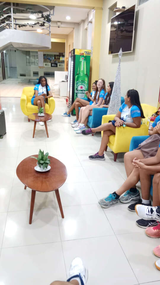 Texto de Imagen: Las voleibolistas de Sumak Selva listas para dar declaraciones sobre su participación en la Liga Nacional Superior.