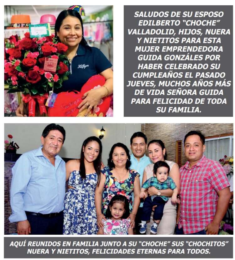 Saludos de su esposo Edilberto “Choche” Valladolid , hijos, nuera y nietitos para esta mujer emprendedora Guida Gonzáles por haber celebrado su cumpleaños el pasado jueves, muchos años más de vida señora Guida para felicidad de toda su familia.