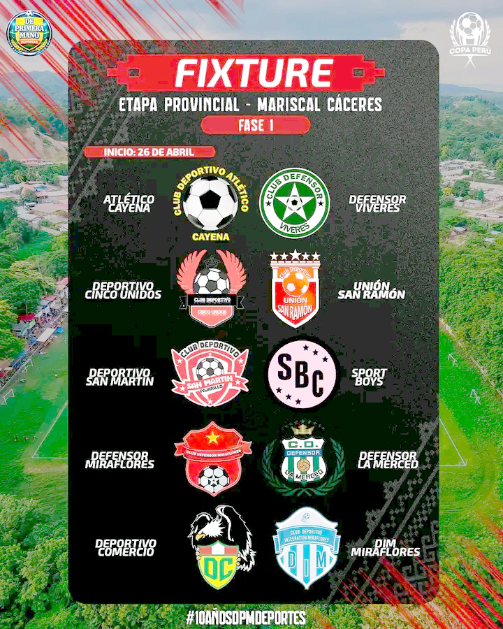 *** También en nuestra provincia de SAN MARTIN, desde hoy se juegan los partidos de ida de la primera fase provincial de la Copa Perú, de la siguiente manera: Grupo “A” en Morales JUVENTUD CATOLICA Vs. SUACE FC. Grupo “B” en Juan Guerra ORIENTE JUAN GUERRA Vs. BRISAS DE SAN ANTONIO DE CUMBAZA. Grupo “C” esta tarde sabatina en nuestros Estadio Municipal NUEVO UNION TARAPOTO FC Vs. BATES FC. Grupo “D” en Chazuta UNIVERSITARIO Vs. INDEPPENDIENTE DE MORALES. Grupo “E” en Cacatachi ORIENTE TARAPOTO Vs. H&G FC. Grupo “F” en Yarina SPORT YARINA Vs. REAL PALMERA. Grupo “G” en San Antonio de Cumbaza BOLOGNESI Vs. FLORIDA FC y Grupo “H” en Shapaja LUIS DE LA PUENTEN UCEDA Vs. INDEPENDIENTE DE SAUCE. Pasa a la segunda fase REAL HUIMBAYOC.