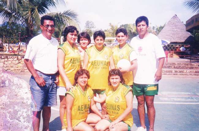 Texto de Imagen: Equipo de voleibol femenino de la UNIVERSIDAD NACIONAL DE LA SELVA, con su entusiasta entrenador Ing. Ríos Navas, todos, aunque ya viejitos esperan se reinicie las Olimpiadas Inter Colegios Profesionales.