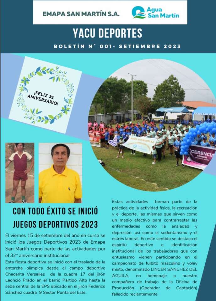 *** Esta noche siguen las competencias deportivas de fulbito masculino y voleibol mixto por los 32 Aniversario de EMAPA SAN MARTIN que justamente se inició el pasado martes 19 con los siguientes resultados, en Fulbito. GERENCIA DE INGENIERIA PROYECTOS Y OBRAS 1 – 2 GEREENCIA GENERAL, DISTRIBUCION 7 – 0OFICINAA ZONAL SISA y GERENCIA COMERCIAL 5 – 2 PRODUCCION. En voleibol mixto: GERENCIA COMMERCIAL 2 – 0 PRODUCCION, GERENCIA DE INGENIERIA PROYECTOS Y OBRAS 2 – 0 GERENCIA GENERAL y DISTRIBUCION 2 – 0 OFICINA ZONAL SISA. Los partidos de esta noche por la segunda fecha son, en fulbito: OFICINA ZONAL SISA Vs. GERENCIA COMERCIAL, PRODUCCION Vs. GERENCIA DE INGENIERIA PROYECTOS Y OBRAS y GERENCIA GENERAL Vs. GAF. En voleibol mixto: GERRENCIAA GENERAL Vs. GAF, OFIINA ZONAL SISA Vs. GERENCIA COMERCIAL y PRODUCCION Vs. GERENCIA DE INGENIERIA PROYECTOS Y OBRAS,, estas competencias deportivas llevan el nombre de “Lincer Sánchez del Aguila” en honor al ex trabajador que nos dejó para siempre hace casi un mes.