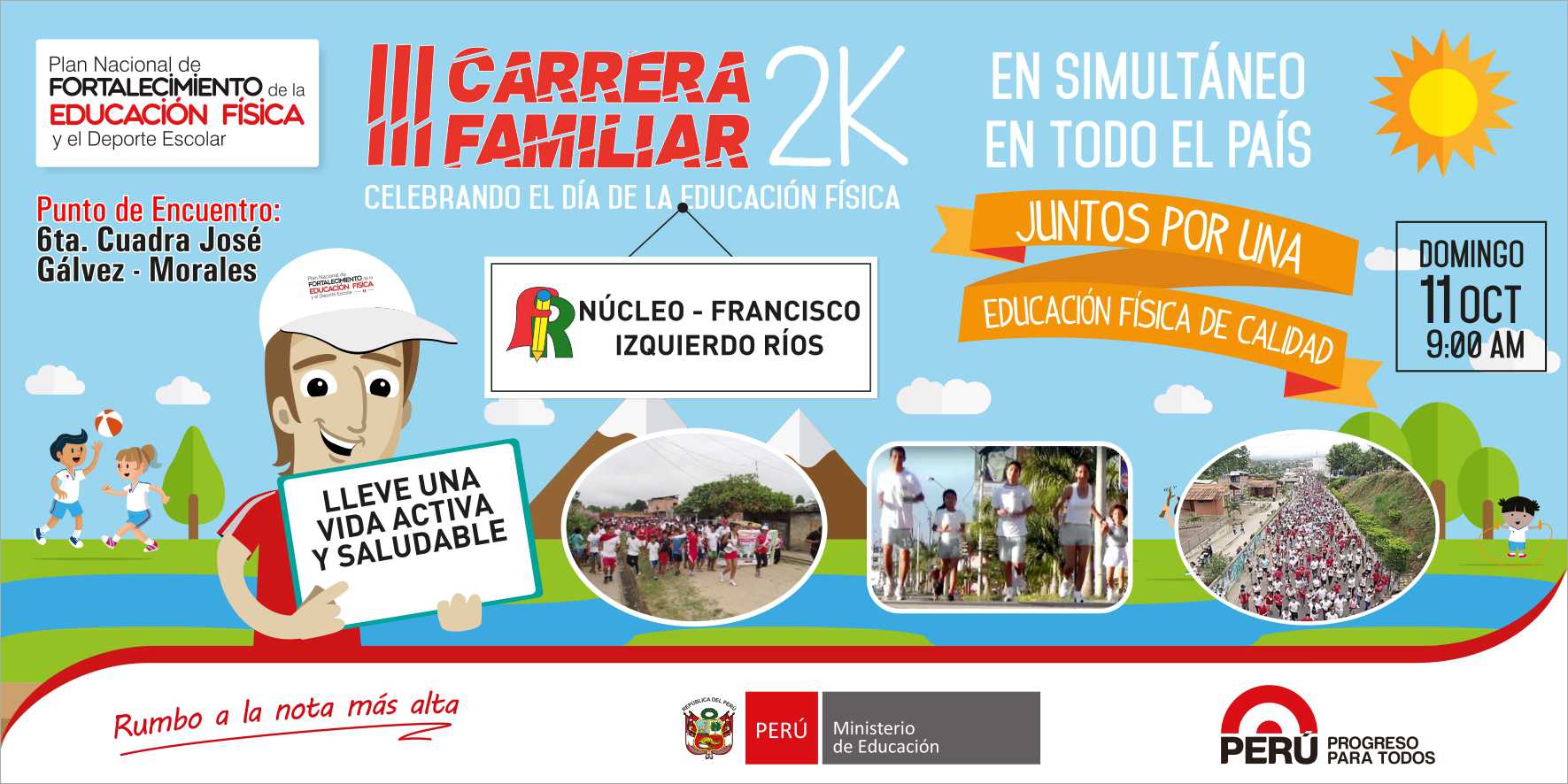 Todo está listo para la III CARRERA FAMILIAR 2K “JUNTOS POR UNA EDUCACION FISICA DE CALIDAD” del plan nacional de fortalecimiento de la Educación Física y el deporte escolar organizado por el Ministerio de Educación, UGEL – núcleo Francisco Izquierdo Ríos con sus IIEE alimentadoras Maria Ulises Davila Pinedo y 0005 – Morales. Afirma la Lic. Mg. Alicia Gatica Rodríguez coordinadora del núcleo. Este Domingo 11 de octubre de 8:30 a 12:00 m. las 493 redes de Educación física y los 542 núcleos concentrados menores del plan “Juntos por una Educación Física de calidad”; a fin de promover y motivar una vida activa y saludable en familia. La citada actividad se enmarca en lo establecido en el punto 6.5.16 de la R.S.G. N° 2069- 2014/MINEDU que establece a nivel de Directores de la DRE Y/O UGEL “realizar actividades de sensibilización con los padres de familia de los estudiantes sobre los alcances, beneficios y horarios de las actividades de educación física y deporte escolar”.