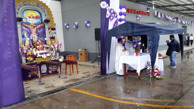 Tarapoto. Desde ayer por la madrugada la imagen del Señor de los Milagros pernota en la explana del Hospital Regional de Tarapoto, donde ayer al mediodía se realizó una ceremonia litúrgica dirigida al personal de ese nosocomio y para los pacientes. A pesar de la llovizna el párroco de la ciudad realizó la misa cerca de la puerta principal del Área de Emergencia.