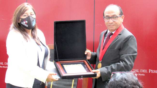 La máxima autoridad judicial de San Martín, Heriberto Gálvez Herrera, realizó en acto público el reconocimiento a la doctora Elvia Barrios Alvarado, presidenta del Poder Judicial del Perú, al doctor Javier Arévalo Vela, Juez Supremo de la Corte Suprema de Justicia de la República, y a la doctora Jessica Medina Jiménez, responsable del Equipo Técnico de Implementación de la NLPT.