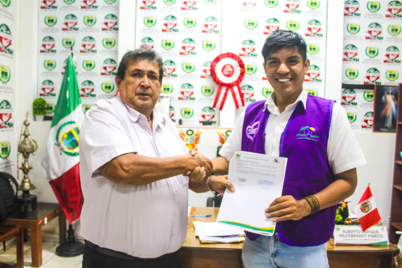 El alcalde Enrique Hildebrandt Pinedo y el presidente de la Asociación APRODMAYO, Oscar Cárdenas Yon, firmaron un Convenio de Cooperación Interinstitucional entre la Municipalidad Distrital de La Banda de Shilcayo y la Asociación Protectora de los Derechos de la Mujer Mayo (APRODMAYO).