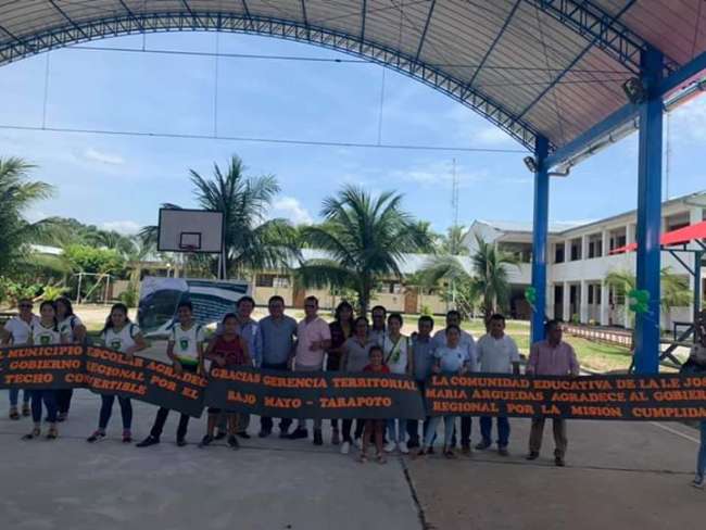 Ambiente de júbilo y algarabía se vivió en la jornada inaugural de los techos convertibles permanentes de la Institución educativa del nivel secundario, José María Aguedas, del distrito de Cacatachi, provincia de San Martín.