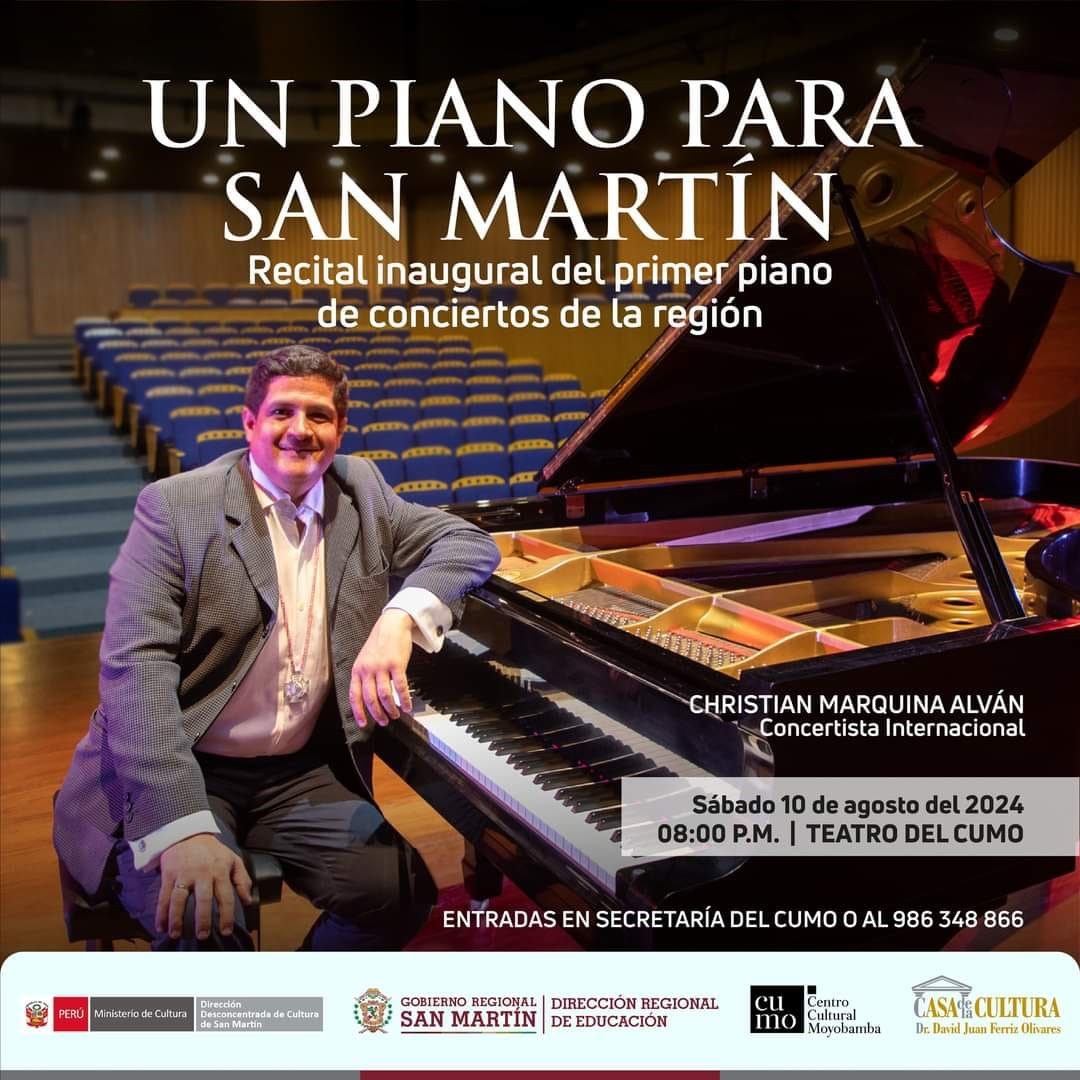 HOY es muy grato compartir la noticia histórica para nuestra región del próximo RECITAL INAUGURAL DEL PRIMER PIANO DE CONCIERTOS DE LA REGIÓN SAN MARTÍN, en el Teatro del grandioso y moderno CENTRO CULTURAL MOYOBAMBA. Un magnífico PIANO DE COLA MARCA YAMAHA C7, construido en las mismas fábricas de Japón (y no en China) lo que sin duda le da un plus de calidad.