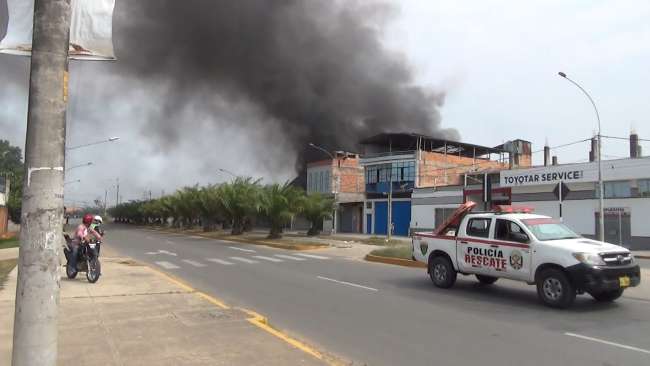 Eran las dos de la tarde cuando se reportó un incendio de grandes proporciones en un almacén cerca de un grifo de venta de combustible en Tarapoto, los vecinos de la zona vivieron momentos de tensión cuando se percataron que las llamas alcanzaron a un camión cisterna que afortunadamente estaba vacía. Sin embargo, el temor era que llegue a los tanques de almacenamiento de gasolina del grifo.