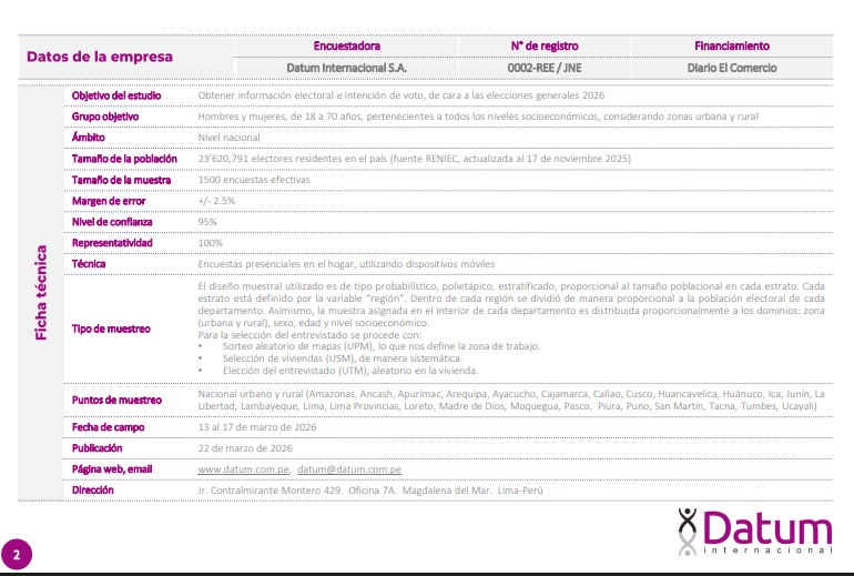 El estudio de opinión pública electoral (13 al 17 de marzo de 2026) revela el 21.1% aún no sabe por quién votar y un 16.4% optaría por ninguno, blanco o viciado, en un escenario con múltiples partidos que fragmentan el voto y una marcada apatía ciudadana.