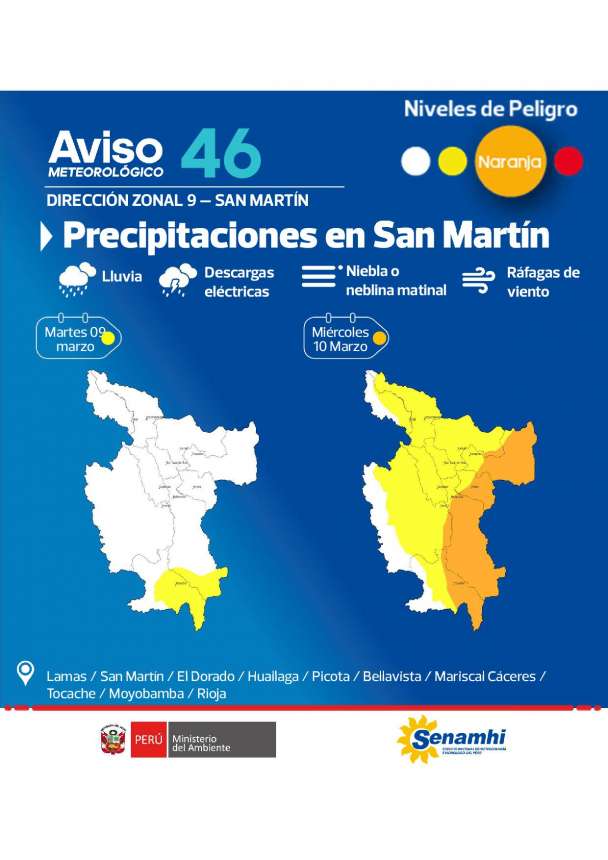De acuerdo al aviso, para el martes 9 se prevén acumulados sobre los 40 mm/día en la selva centro y por encima de los 60 mm/día en la selva sur; mientras que para el miércoles 10 se espera acumulados sobre los 60mm/día en la selva norte, y por encima de los 40 mm/día en la selva centro.