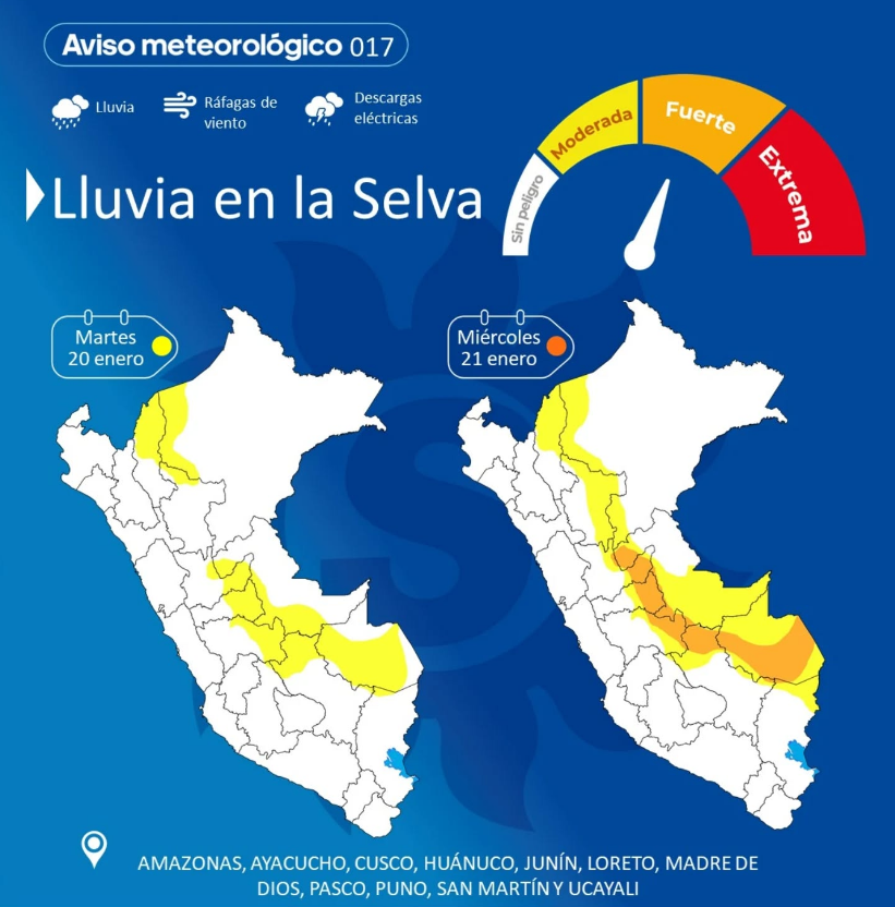 Según el informe, este fenómeno afectará a las regiones de Amazonas, Ayacucho, Cusco, Huánuco, Junín, Loreto, Madre de Dios, Pasco, Puno, San Martín y Ucayali, y se presentaría durante los días martes 20 y miércoles 21 de enero de 2026.