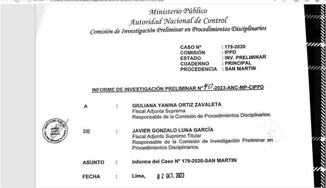 En el Informe de Investigación Preliminar n°40-2023-ANC-MP-CIPPD, de fecha 2 de octubre 2023, obtenida por este Diario, se puede ver que, el Fiscal Adjunto Supremo Titular Javier Gonzalo Luna García, como responsable de la Comisión de Investigación Preliminar en Procedimientos Disciplinarios del Ministerio Público, recomienda se declare, el inicio de procedimiento disciplinario contra Jorge Eduardo Vergara Villanueva, en su condición de Fiscal Superior de la Primera Fiscalía Superior Penal de San Martín; y contra José Antonio Alvarado Puluche, Fiscal provincial de la Fiscalía Provincial Especializada en Delitos de Corrupción de Funcionarios de San Martín – Moyobamba.