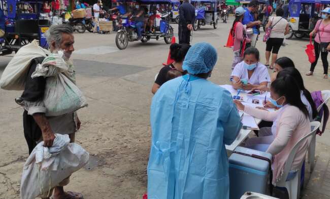 Ayer por la mañana decenas de personas se vacunaron contra el Covid – 19 en los exteriores del mercado II de Tarapoto, lugar donde personal del centro de Salud de la urbanización Nueve de Abril instaló un puesto móvil para aplicar las dosis que necesita la población, de esta manera están descentralizando el proceso de vacunación en la ciudad.