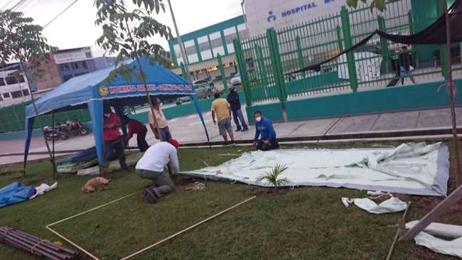 Integrantes de grupos solidarios como “El Colectivo Alto”  Mayo «Juntos Sí Podemos», Caritas y la Cruz Roja instalaron carpas a las afueras del Hospital de Moyobamba a fin que los familiares de  pacientes que se encuentran internados a causa del Covid-19 puedan protegerse de inclemente sol, la lluvia y pernoctar.