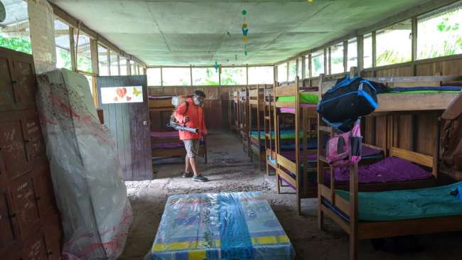 Se busca garantizar condiciones de salubridad para la entrega de los desayunos y almuerzos escolares que brinda el Programa Nacional de Alimentación Escolar QALI WARMA #Fumigación. Los ambientes destinados al almacenamiento de los productos Qali Warma, así como las cocinas y comedores de las instituciones educativas del ámbito del distrito de Juanjui, vienen siendo fumigados por la Municipalidad Provincial y la Red de Salud de Mariscal Cáceres, antes del inicio de las clases escolares. Esta acción se realiza en cumplimiento de los acuerdos multisectoriales asumidos por las autoridades para garantizar condiciones de limpieza y seguridad alimentaria en el marco del Buen Inicio del Año Escolar-BIAE 2020. Como está previsto, estos días los centros escolares de la Educación Básica regular, recibirán los correspondientes lotes de productos para el servicio alimentario escolar por parte del Programa Nacional de Alimentación Escolar Qali Warma. Acorde a ello, y en labor conjunta, personal especializado de la municipalidad y de salud están realizando la desinfección de las cocinas, comedores y almacenes de las instituciones educativas para recepcionar en las mejores condiciones de salubridad dichos productos, que a partir del lunes 16 de marzo serán preparados y distribuidos en los desayunos y almuerzos que se ofrece a los estudiantes, durante la jornada escolar, para complementar su alimentación. La fumigación multisectorial busca además, cero presencia de roedores y otros insectos que puedan causar enfermedades y poner en riesgo la salud escolar. (Carlo Augusto)