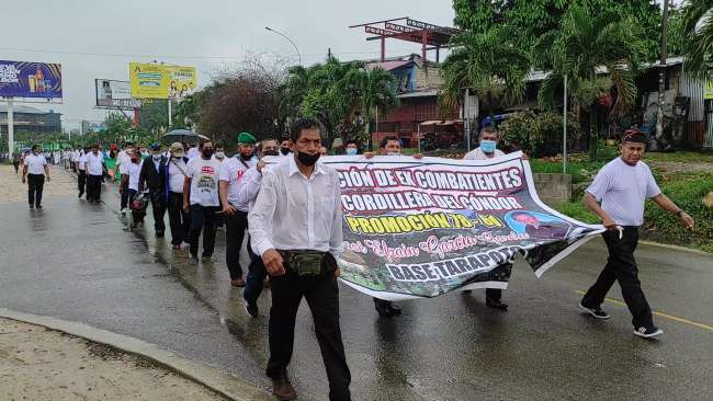 A pesar de la torrencial lluvia de ayer, los integrantes de la asociación de Defensores de la Patria, organización que lo integran los licenciados de las fuerzas armadas que participaron en los conflictos con el vecino país de Ecuador de Falso Paquisha y del Alto Cenepa, se movilizaron desde Morales hacia la plaza Mayor de Tarapoto, exigiendo atención de parte del gobierno central para que les den los beneficios que les corresponde.