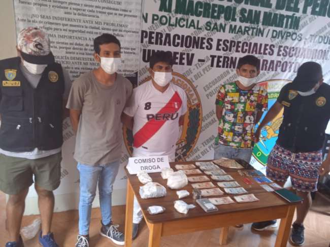 Tres presuntos microcomercializadores de droga que transportaban más de 600 gramos de clorhidrato de cocaína y 145 gramos de marihuana, fueron detenidos por los agentes del grupo Terna, en la cuadra siete del jirón Los Ángeles del barrio Atumpampa de Tarapoto. Dentro de sus pertenencias encontraron más de 13 mil soles que sería producto del negocio ilícito