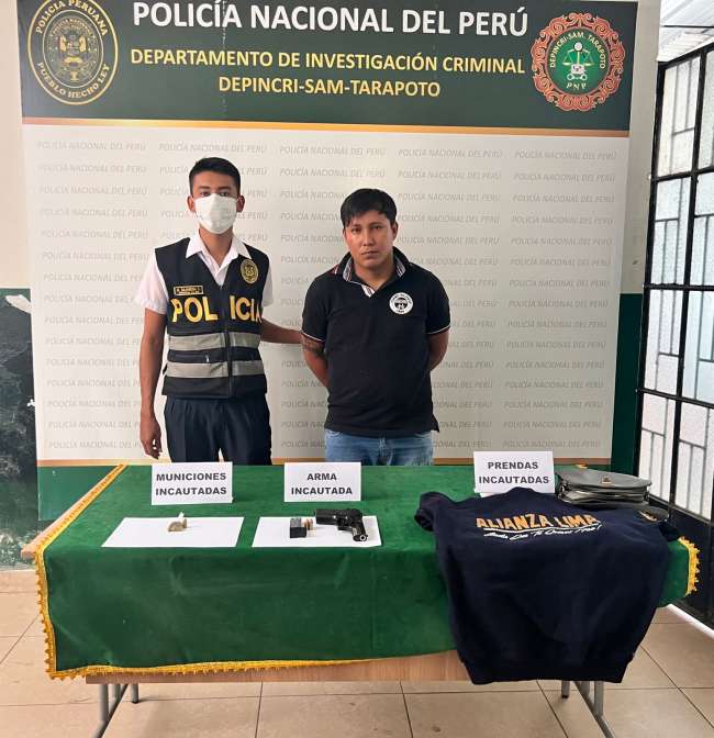 Tras identificar a uno de los principales sospechosos del asalto ocurrido el jueves por la tarde en la vidriería El Dorado, agentes del Departamento de Investigación Criminal de Tarapoto intervinieron a un joven y entre sus pertenencias los miembros de las fuerzas del orden encontraron una pistola con el número de serie borrado.