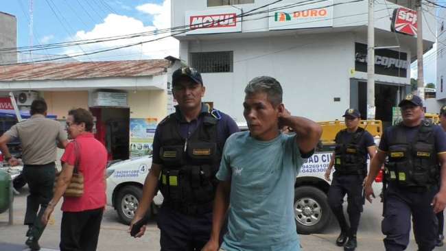 Tras permanecer unos minutos en la dependencia policial Ramírez Yuimachi fue puesto en libertad y ahora los serenos de Tarapoto recomiendan tener cuidado con este sujeto que siempre para por los alrededores del mercado Dos de Tarapoto que está ubicado en el barrio Comercio. (Hugo Anteparra)