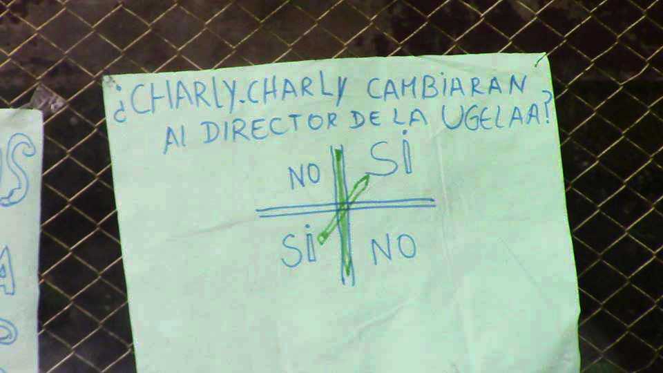 Ayer se pudo ver varias pancartas con frases alusivas al pedido de destitución del funcionario, entre ellos una que decía: “Charly, Charly, cambiarán al director de la UGELAA, y en el dibujo de los lápices se observa que uno se inclina a la respuesta SI”. (Róger Torres Chujutalli)