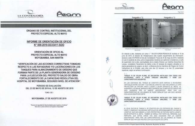 La Contraloría General determinó un perjuicio económico de S/ 2´569,477 en el Gobierno Regional de San Martín por la irregular acreditación de términos contractuales y pagos parciales en la adquisición de una planta generadora de oxígeno para el Hospital de Moyobamba. Cinco exfuncionarios tendrían presunta responsabilidad penal y administrativa en estos hechos.