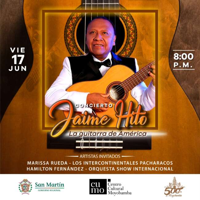La población de Moyobamba, se prepara para recibirlo al gran Jaime Hito, con todo el cariño y la algarabía selvática, el próximo viernes 17 de junio en el centro cultural (CUMO), a las 8 de la noche. Será una noche inolvidable de mucho romanticismo con valses, boleros y otros géneros musicales que serán cantados por otros artistas que acompañan a la guitarra de América, como: Los intercontinentales Pacharacos, Marissa Rueda, la voz al estilo de Carmencita Lara, Hamylton Fernández, el misterio del corazón, la orquesta show internacional de Pedro Balena y sus gatos, todo este espectáculo en homenaje a papá con música del recuerdo.