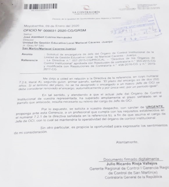 Si bien es cierto, dicho oficio N° 000031-2020, está destinado al anterior director UGEL, José Alémbert Cotrina Hernández, existe responsabilidad del actual director UGEL Wildoro Pinchi Daza, quien estaría haciendo caso omiso a dicho documento del gerente regional de la Contraloría de San Martín, Julio Ricardo Rioja Vallejos.