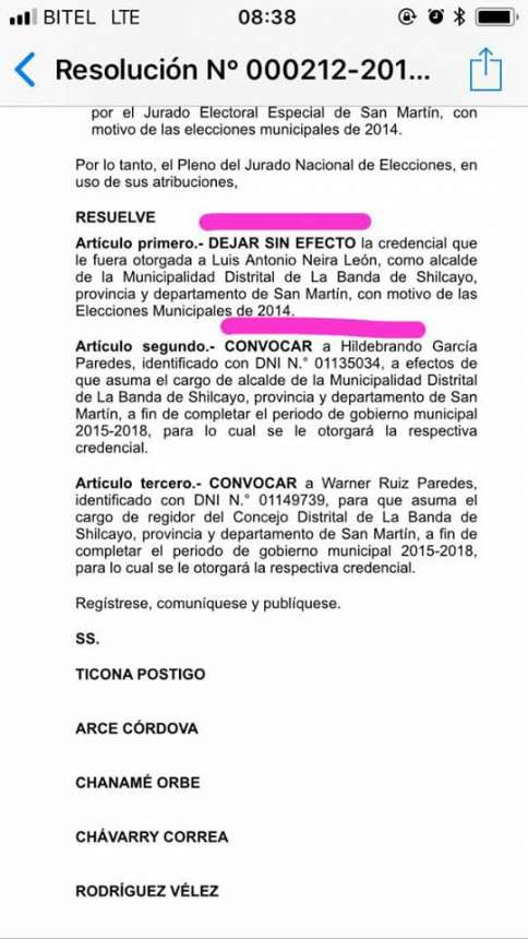 Mediante Resolución 212-2018, el Jurado Nacional de Elecciones convoca a Hidebrando García Paredes para que asuma el cargo de alcalde de la Municipalidad Distrital de La Banda de Shilcayo, ante la renuncia de Luis Alberto Neira León, para lo cual se le otorgará su respectiva credencial.