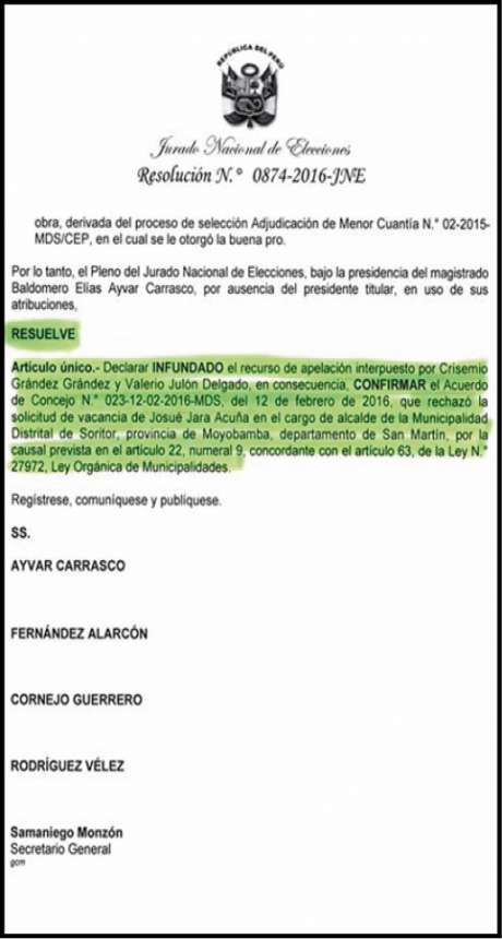 Mediante Resolución Nº 0874 -2016 de fecha 14 de junio, el Jurado Nacional de Elecciones (JNE) declaró improcedente el recurso de apelación presentado por los ciudadanos Crisemio Grandez Grandez y Valerio Julón Delgado contra el acuerdo de consejo del año en curso, en el cual por mayoría se declaró infundado el pedido de vacancia contra el alcalde del distrito de Soritor Josué Jara Acuña.