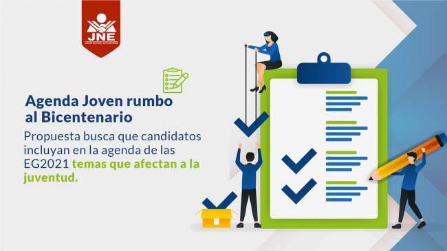 El Jurado Nacional de Elecciones (JNE), junto con otras organizaciones del país, pone a disposición la consulta virtual “Agenda joven rumbo al Bicentenario”, a fin de recibir los planteamientos y demandas prioritarias de la juventud para que puedan ser consideradas en la agenda de los candidatos a las próximas Elecciones Generales.