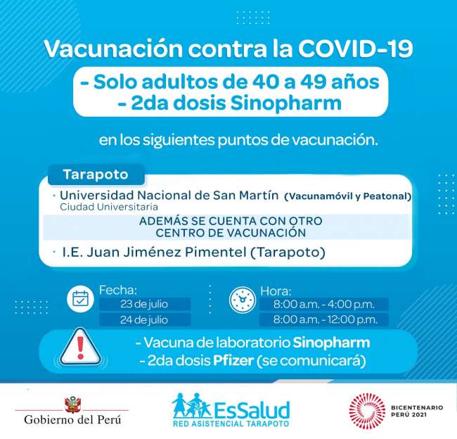 Esta semana realizaremos la jornada de vacunación el viernes 23 de 8:00 de la mañana hasta las 4:00 de la tarde y el sábado 24 de julio, de 8:00 am a 12:00 del mediodía.