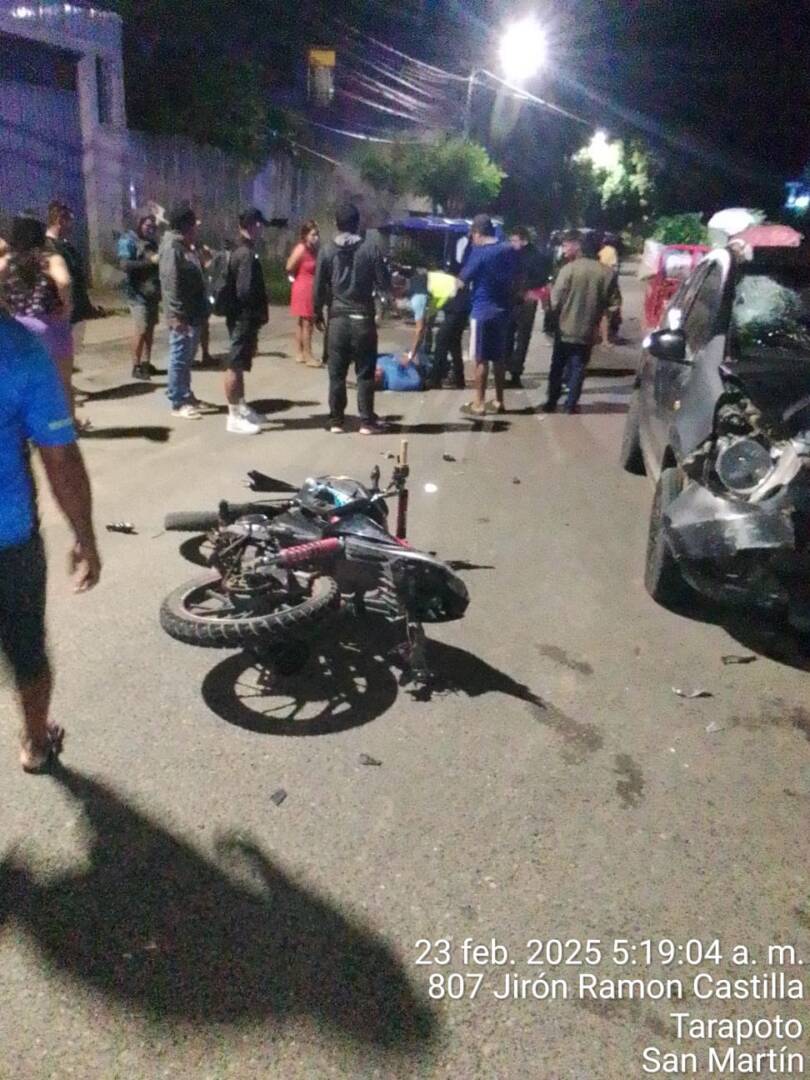 Un joven identificado como Carlos Sebastián Ruiz García, de 28 años, se encuentra gravemente herido luego de ser atropellado por una camioneta en la cuadra 8 del jirón Ramón Castilla, en Tarapoto. El accidente ocurrió cuando Ruiz García descendió de una motocicleta para recoger un objeto caído, pero al tropezar terminó en la pista y junto a su amigo que le enfocaba con la luz de la motocicleta en la que se desplazaban terminaron arrollados.