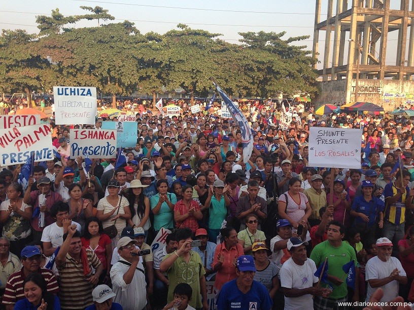 Una multitud de entusiastas pobladores de Tocache y sus distritos, se dio cita en el parque La Unión, para recibir al Econ, Julio Cárdenas, candidato a la Presidencia del Gobierno Regional por APP,  en el mitin de presentación de los candidatos de Tocache  con miras a las elecciones del 5 de octubre.