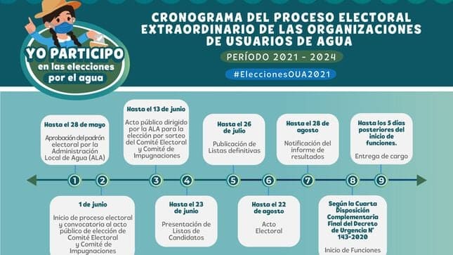 De acuerdo al cronograma establecido, las Administraciones Locales del Agua (ALA), tienen plazo hasta el 28 de mayo para aprobar el padrón electoral. Por su parte, las organizaciones de usuarios presentan ante el Comité Electoral las listas de candidatos hasta el 23 de junio. La publicación de listas definitivas está programada hasta el 26 de julio y el acto electoral podrá realizarse hasta el domingo 22 de agosto de 2021.