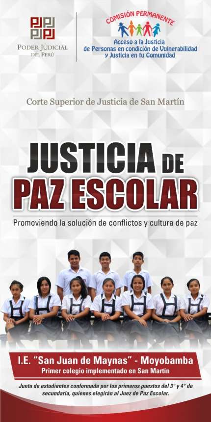 La Corte Superior de Justicia de San Martín a través de la Comisión Distrital del Programa de Acceso a la Justicia de Personas en Condición de Vulnerabilidad y Justicia en tu Comunidad de esta sede judicial, juramentarán al Juez de Paz Escolar y Secretario de Paz Escolares, el 2 de Diciembre del año en curso.