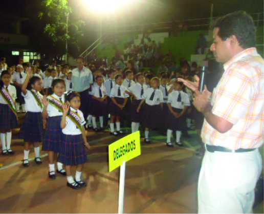 Luego de la entonación del Himno Nacional, el Himno, el Alcalde juramentó a los delegados escolares y luego los padrinos procedieron a colocar los cordones e insignias a los estudiantes, con lo que se les identificaba como autoridades de las aulas.