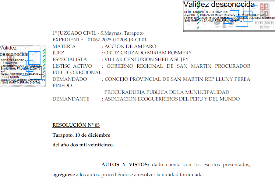 El Primer Juzgado Civil de San Martín, a cargo de la jueza Miriam Rosmery Ortiz Cruzado, emitió la Resolución N.º 05 del expediente 01067-2025-0-2208-JR-CI-01, en el marco de la acción de amparo presentada por la Asociación Ecoguerreros del Perú y del Mundo contra el Concejo Provincial de San Martín, por la aprobación de la Ordenanza Municipal 022-2025-MPSM que autorizó el Plan Específico «Prana Lagoons» en un predio de 39.0281 hectáreas en el sector Ricuricocha. La decisión judicial contiene una importante conclusión legal y revela posibles implicancias para el actuar del alcalde y de los regidores.
