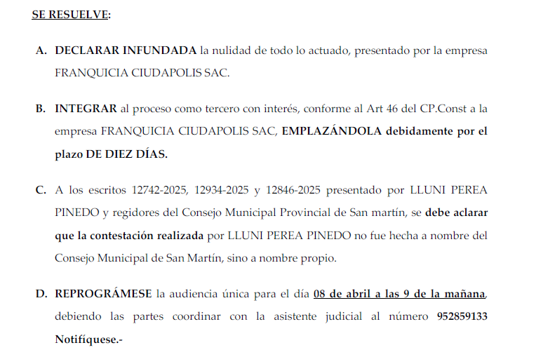 El juzgado declaró infundado el pedido de nulidad presentado por la empresa Franquicia Ciudapolis SAC, promotora directa del proyecto inmobiliario. La compañía alegaba ser litisconsorte necesario, pero la jueza sostuvo con claridad que, aunque la decisión del proceso podría afectarla, no tiene la misma condición jurídica que la entidad que emitió la ordenanza cuestionada, es decir, el Concejo Provincial. Por ello, aplicando el Artículo 46 del Código Procesal Constitucional, dispuso integrarla solo como «tercero con interés», otorgándole un plazo de 10 días hábiles para absolver la demanda.
