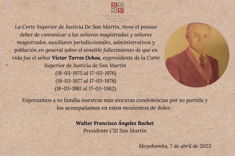 Que, estando a la comunicación efectuada se ha tomado conocimiento que el día de hoy 7 de abril de 2023 se produjo el sensible fallecimiento del señor doctor Víctor Torres Ochoa, ex Vocal Superior Titular y ex Presidente de la Corte Superior de Justicia de San Martín durante los periodos del 18 de marzo de 1975 al 17 de marzo de 1976, del 18 de marzo de 1977 al 17 de marzo de 1978 y del 18 de marzo de 1981 al 17 de marzo de 1982, cuyas exequias se efectuarán el día 8 de abril de 2023 en la ciudad de Chiclayo.