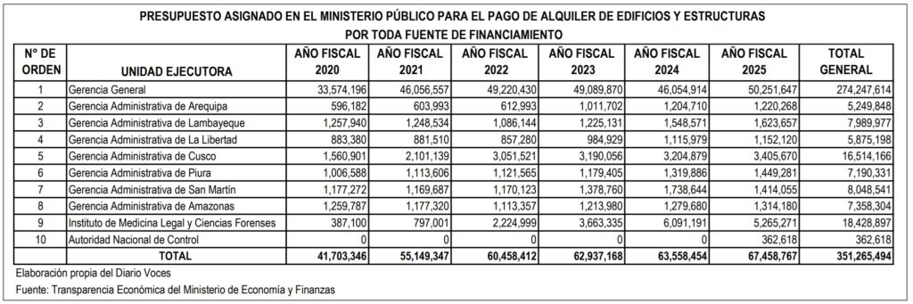 A pesar de las constantes quejas sobre la precaria infraestructura donde operan las fiscalías del país, el Ministerio Público ha destinado en los últimos seis años un total de S/ 351’265,494 exclusivamente para el pago de alquiler de edificios, según información de Transparencia Económica del MEF a la que accedió este medio. El dato revela una brecha estructural que no ha sido atendida mediante proyectos de inversión destinados a construir locales propios.