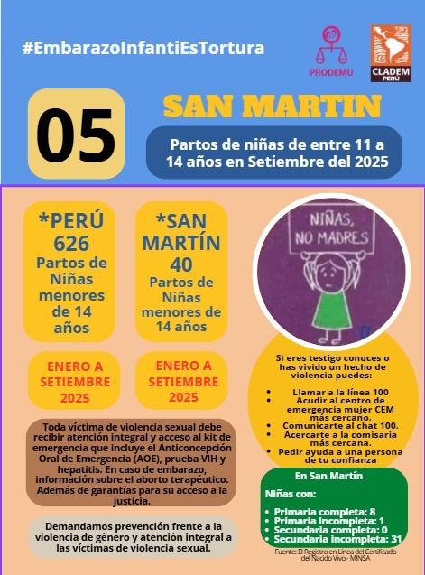 El 2025 ha revelado una crisis alarmante en el Perú, especialmente en la región San Martín, donde el embarazo infantil forzado se mantiene como una de las más graves expresiones de violencia contra niñas y adolescentes. Las infografías elaboradas por CLADEM Perú y PRODEMU exponen una realidad de vulnerabilidad y desamparo que exige una respuesta urgente y coordinada del Estado y la sociedad civil.