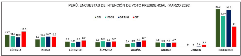 A 23 días de las elecciones generales del 12 de abril, el escenario electoral peruano presenta una característica inédita, incluso para un sistema político históricamente fragmentado, inestable y sorpresivo: niveles muy bajos de intención de voto, con dos candidatos en los primeros lugares y una docena de candidatos con dos a cinco puntos.