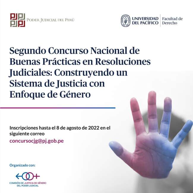 El Poder Judicial, a través de la Comisión de Justicia de Género, y la Facultad de Derecho de la Universidad del Pacífico oficializaron el lanzamiento del ‘Segundo Concurso Nacional de Buenas Prácticas en Resoluciones Judiciales: Construyendo un Sistema de Justicia con Enfoque de Género’, el cual tiene por finalidad incentivar y distinguir las buenas prácticas judiciales en temas de igualdad y violencia de género, así como reconocer la labor y el compromiso de juezas y jueces contra todo tipo de discriminación en nuestro país.