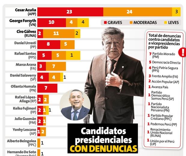 El primero en la lista es el candidato de Alianza Para el Progreso (APP), César Acuña, quien también posee mayor cantidad de denuncias graves en su contra, entre las que figuran cinco por el presunto delito de colusión ilegal, cinco por corrupción, una por lavado de activos y otra por plagio.