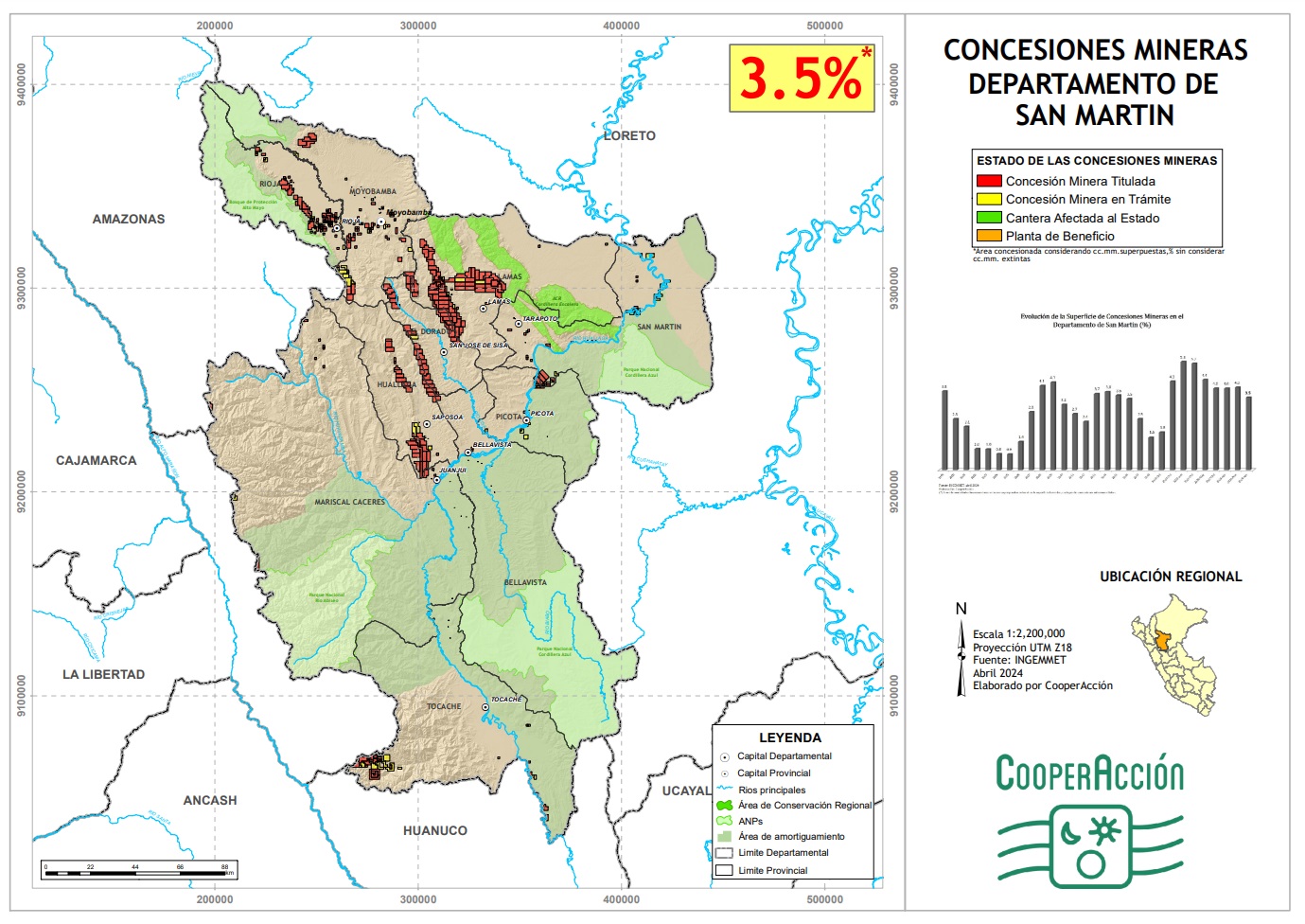 Nosotros tenemos concesiones mineras que ya están instaladas en las provincias de Moyobamba, El Dorado y en el Huallaga. En esos lugares es que nosotros hemos tenido la formulación de petitorios y otorgamiento de concesiones mineras.