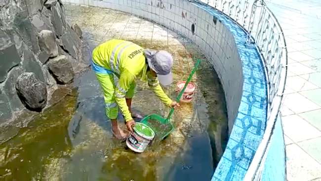 Personal de limpieza de la municipalidad Distrital de Morales ayer luego de la denuncia pública, procedieron a desaguar y retirar la basura acumulada en el interior de la pileta ubicada en el centro de la plaza de armas de Morales.