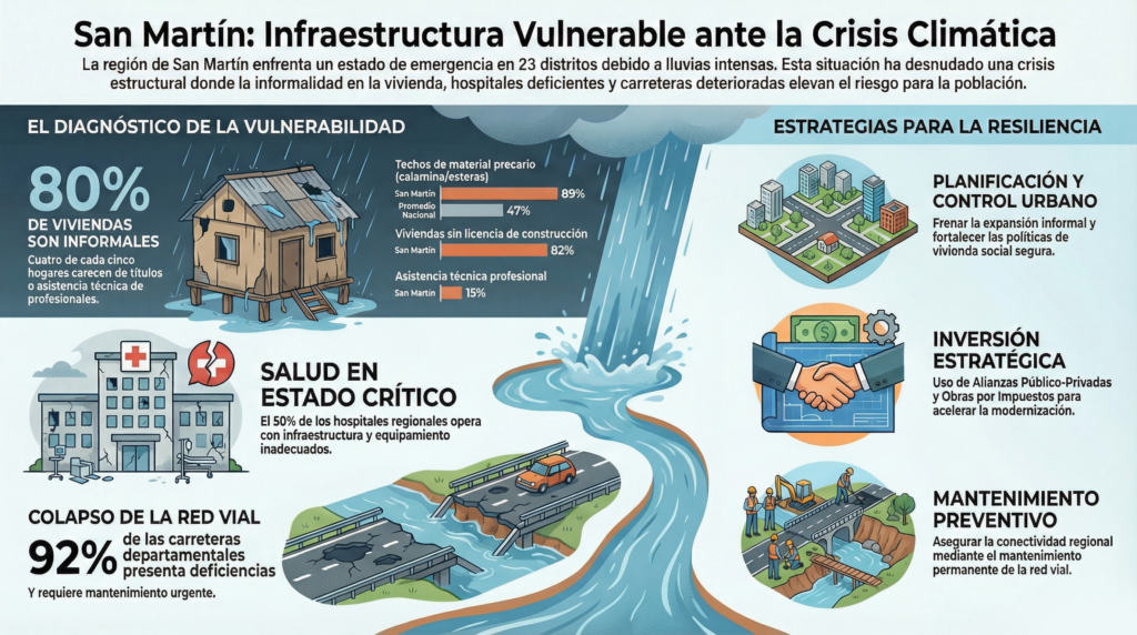 Las lluvias intensas que azotan la región San Martín han puesto en evidencia una grave precariedad de la infraestructura y una alta vulnerabilidad urbana y rural, producto de años de informalidaddébil fiscalización y baja inversión sostenida. Según el Servicio Nacional de Meteorología e Hidrología (Senamhi), las precipitaciones en la selva continuarán con intensidad moderada a fuerte, escenario que ya ha provocado daños en viviendas, carreteras y establecimientos de salud, y llevó a la declaratoria de estado de emergencia en 23 distritos de la región.