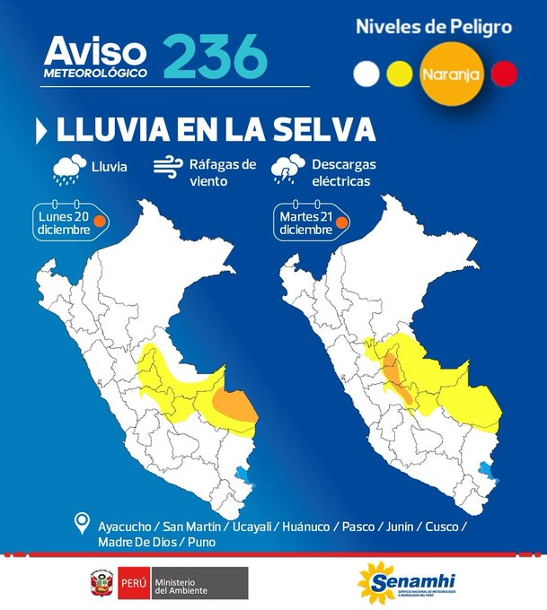 Lluvias de moderada a fuerte intensidad se registrarán este lunes 20 y martes 21 de diciembre en la selva de diez regiones del país, advirtió el Servicio Nacional de Meteorología e Hidrología (Senamhi), que emitió un aviso meteorológico de nivel naranja.