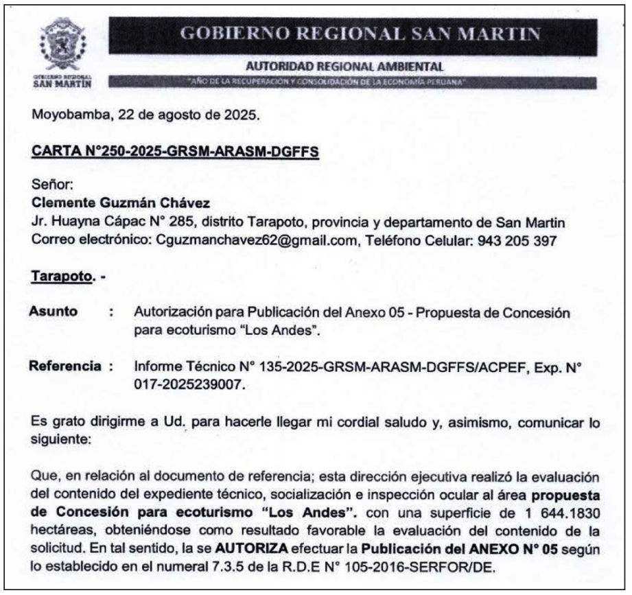 La Autoridad Regional Ambiental de San Martín (ARA), a través de la Dirección de Gestión Forestal y de Fauna Silvestre (DGFFS), emitió la Resolución Directoral N.° 675-2025-GRSM/ARASM/DGFFS, de fecha 27 de noviembre de 2025, declarando conforme el procedimiento para la concesión con fines de ecoturismo denominada “Los Andes”. El expediente fue presentado por el ciudadano Clemente Guzmán Chávez, quien solicitó la evaluación y aprobación de la propuesta que comprende una superficie de 1,644.1830 hectáreas y un perímetro de 17,019.87 metros, ubicada entre los distritos de Saposoa y Alto Saposoa, en la provincia del Huallaga, región San Martín.